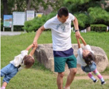 子どもをお膝にのせて、お話を聞いたりて遊びしたり、丸くなったりお馬になったり、体を使いながらいっしょに遊びます。普段忙しいパパも子どもと仲良くなるチャンス!