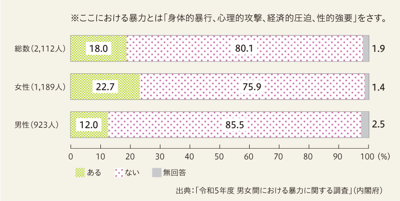 令和5(2023)年に内閣府が行った調査では、交際経験がある人の18.0%、性別でみると女性の22.7%、男性の12.0%は交際相手から暴力を受けたことがあるとしています(図1)。