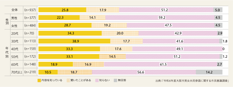 しかし、大阪市の市民意識調査の結果によると、「デートDV」という言葉について「内容を知っている」または「聞いたことがある」と答えた方の数値は、20代〜40代で50%強、全体でも43.7%と半数近くの方が認知されてきたものの、年齢が高くなるにつれて、認知度は低下し、70代では30%に満たない数値となっています(図2)。