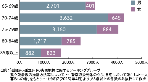 令和6(2024)年4月、「相互に支え合い、人と人とのつながりが生まれる社会」をめざすとして、孤独・孤立対策推進法が施行されました。(※1)この法律を受けて、「孤独死・孤立死」の実態把握に関するワーキンググループが立ち上がり、警察庁のデータなどからまとめた報告書(※2)が公表されています。それによれば、「警察取扱死体のうち、自宅において死亡した一人暮らしの者(令和6(2024)年)」の中で、生前、社会的に孤立していたことが強く推認される「死後8日以上」を経過していたケースは21,856件あります。そのうち65歳以上の15,630件を男女別に抜き出したのが図1です。男性が多いことが一目瞭然で、女性に比べて約3.4倍の方が、社会的に孤立した状況で亡くなっています。