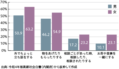 また、令和4年版高齢社会白書で「高齢者の日常生活・地域社会への参加に関する調査」が特集されており、近所の人との付き合い方について尋ねている項目があります。65歳以上の方が「外でちょっと立ち話をする」「物をあげたりもらったりする」「相談ごとがあった時、相談したりされたりする」「お茶や食事を一緒にする」割合は、いずれも男性の方が女性よりも低くなっています(図2)。もっともハードルが低いと思われる「外でちょっと立ち話をする」であっても、男性は約半数の方がしていないと答えていて、男性高齢者の他者とのつながりにくさを示していると考えられます。
